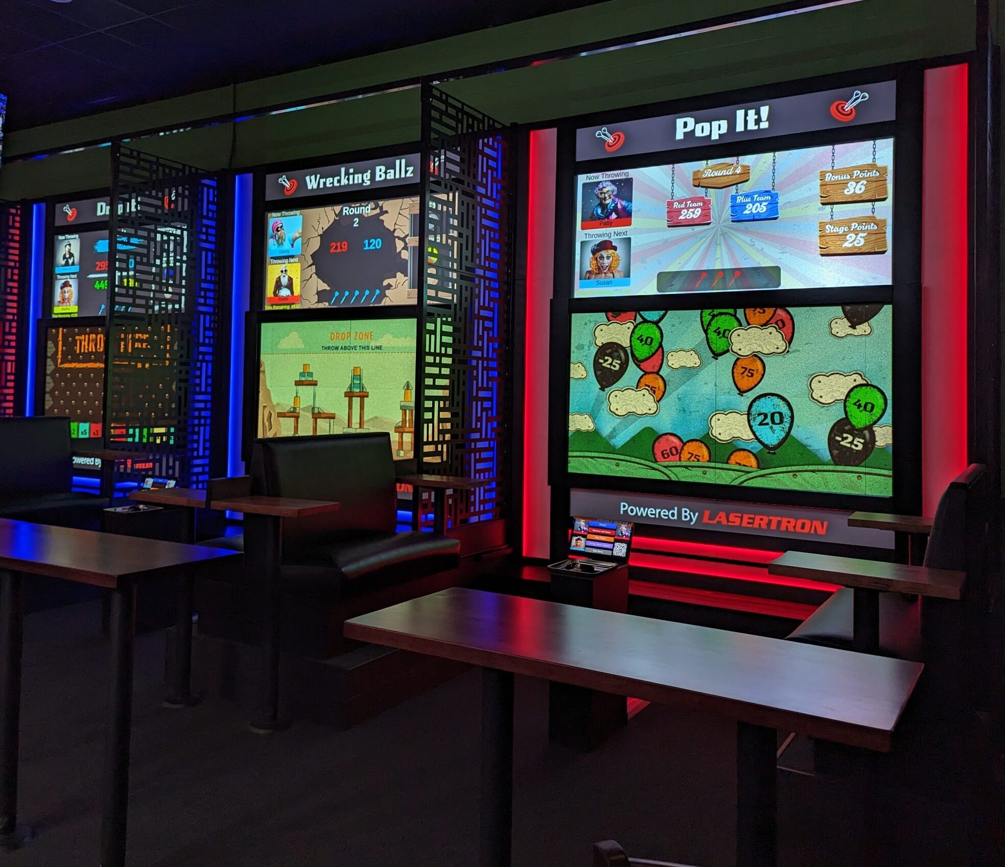 Each bay offers a lounge-style environment with comfortable seating, a dedicated dart setup, and service buttons to call your server.